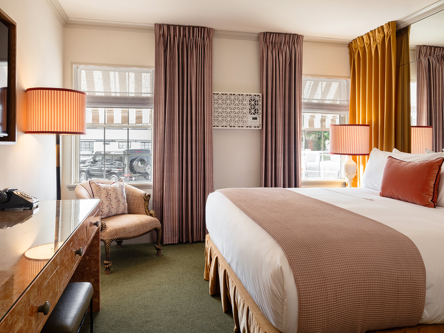 The Lower King, located on the ground floor of The Hôtel Lili, spans 195 square feet (18 square meters) and features a King bed outfitted in Bellino Fine Linens, custom furnishings, a work desk, mini fridge with fully stocked minibar, Grind espresso machine, Diptyque bath amenities, 50-inch flatscreen TV, complimentary Wi-Fi, and so much more.